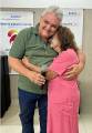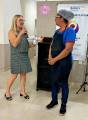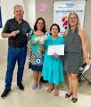 Da esquerda para a direita: 1 homem calça jeans, camiseta polo preta, sorrindo com microfone na mão direita. Seguindo uma mulher. Calça bege, blusa branca com estampas laranjas, óculos. Seguindo uma senhora, vestido longo rosa, colar no pescoço, sorrindo, segurando um certificado, ao lado um homem de calça jeans, camiseta polo verde, sorrindo.