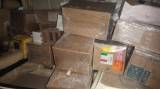 Em um ambiente fechado, apresenta ser um grande galpão, onde o teto com estrutura metálica. Um aviso porte pequeno nas cores branca e azuis, porta aberta e 4 pessoas ao lado em pé. Parecem estarem conversando.