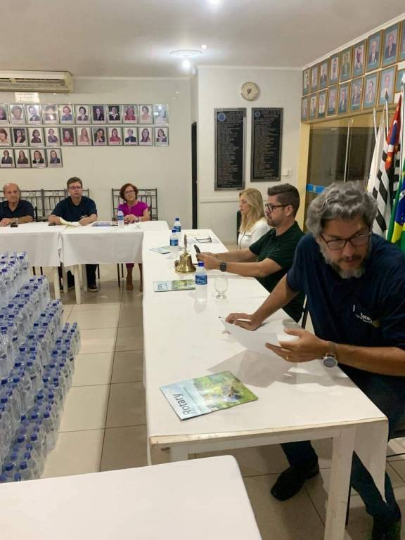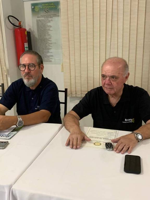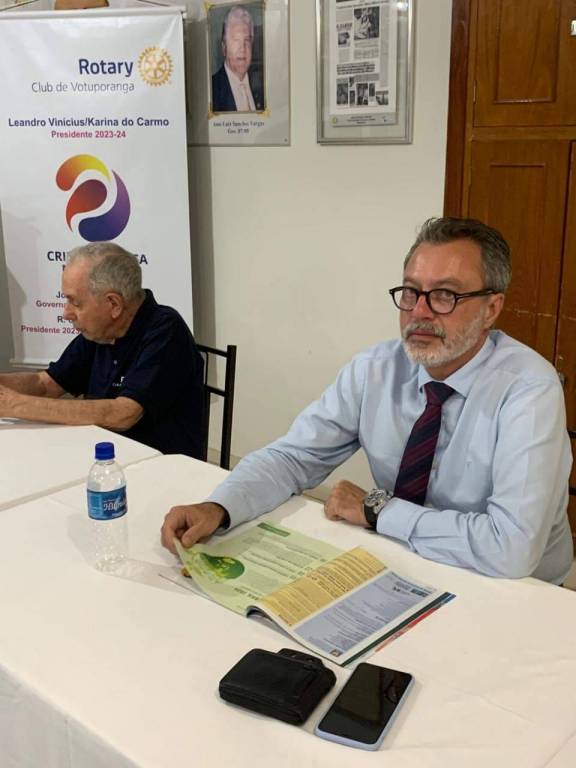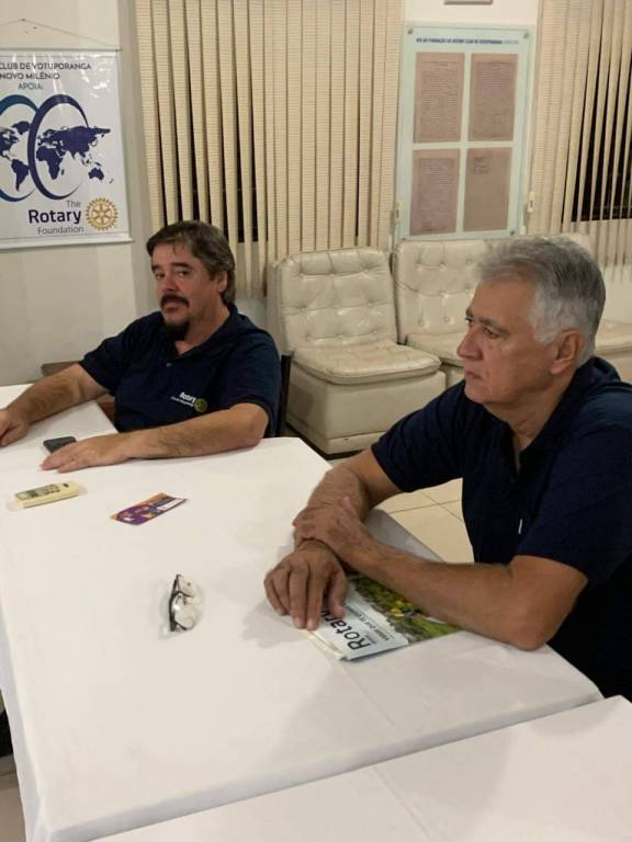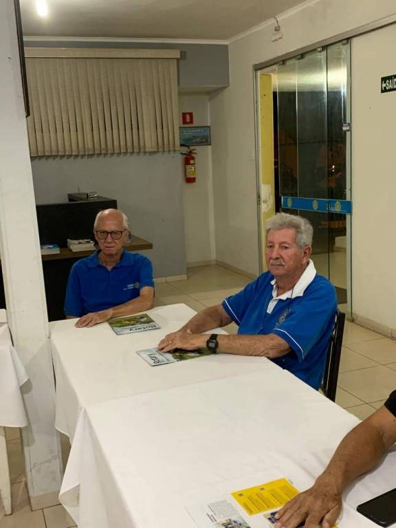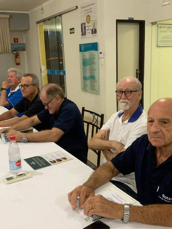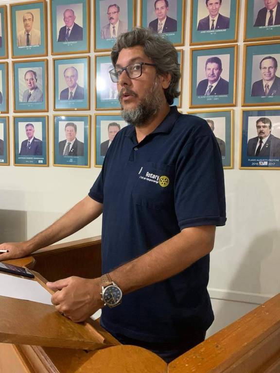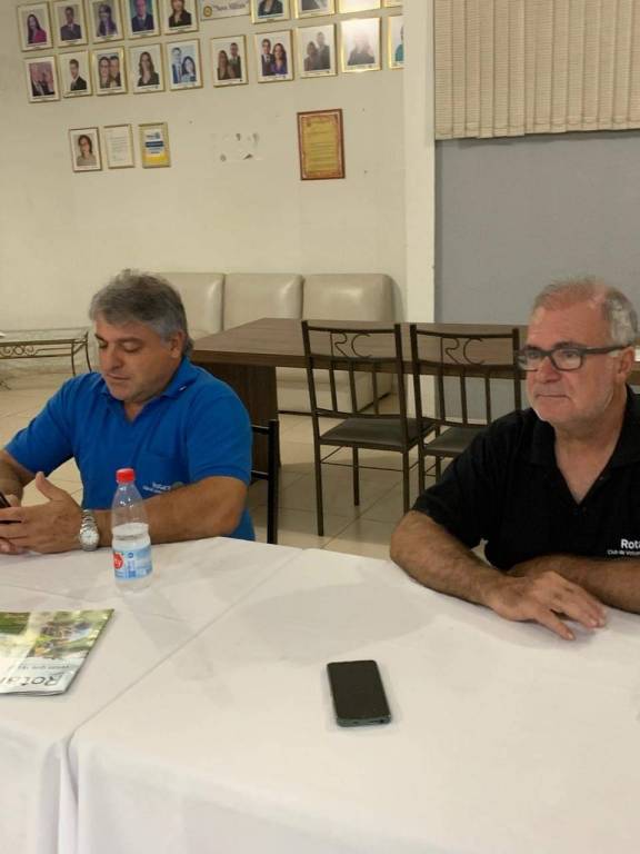 seu martelo, revistas rotárias, garrafinhas d’água e copos. À frente da mesa podemos observar vários fardos de água embalados para transporte. Atrás deles uma galeria de fotos está parcialmente encoberta por um pavilhão de bandeiras e na lateral esquerda observamos uma porta de vidro fechada.