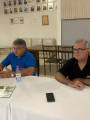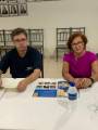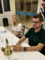 Na foto 2 pessoas identificadas: da esquerda para a direita uma jovem senhora loira e um rapaz de barba, usando óculos, estão sentados atrás de uma mesa com toalhas claras, um sino rotário com