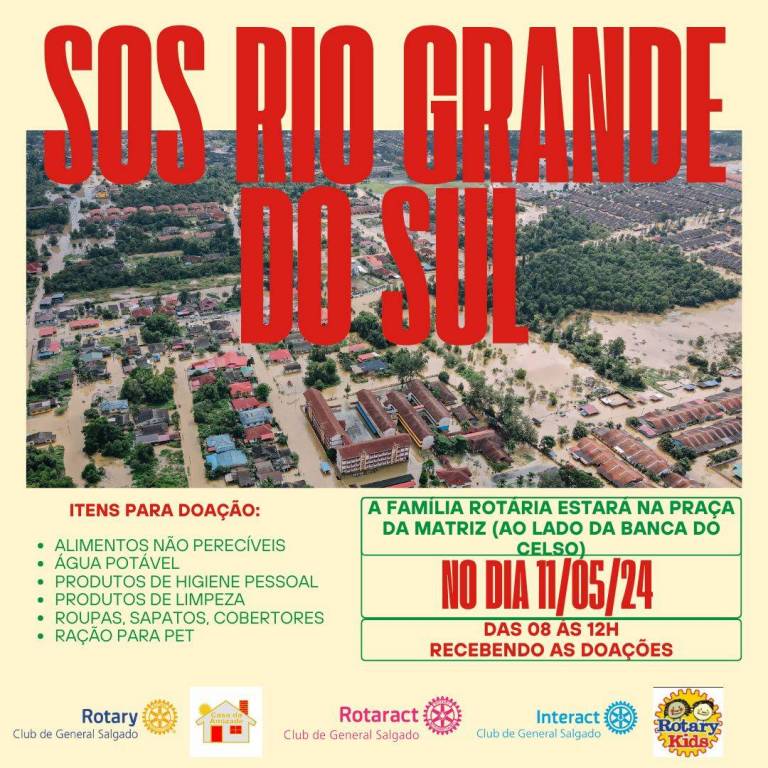 Card com fundo amarelo em tom claro, descrito acima centralizado com letras grandes na cor vermelho: SOS RIO GRANDE DO SUL, sobrepondo uma imagem fotografada de uma cidade alagada. Logo abaixo da imagem escrito em vermelho do lado esquerdo: Itens para Doação e escrito logo abaixo na cor verde: Alimentos não perecíveis, água potável, produtos de higiene pessoal, produtos de limpeza, roupas, sapatos, cobertores, ração para pet. Do lado direito escrito e moldurado em verde: A família rotária estará na praça da matriz ao lado da banca do Celso. Logo abaixo escrito em vermelho: No dia 11 de maio de 2024. das 8 às 12 horas, recebendo doações. Na parte inferior centralizado os logotipos do Rotary Club, da Casa da Amizade, do Rotaract Club, do Interact Club e do Rotary Kids, toda a familia rotária de General Salgado.