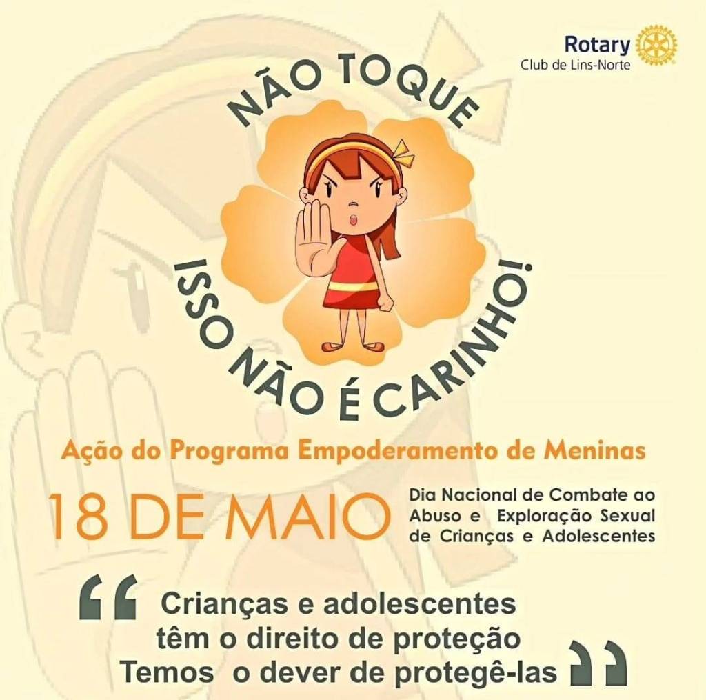 No card com fundo amarelo em tom claro, o desenho de uma criança, com a mão esquerda em sinal de pare e olhar determinado. Acima do lado direito o logo do Rotary Club de Lins - Norte, no centro escrito em círculo: Não toque, isso não é carinho! Dentro do círculo o desenho de uma menina com vestido vermelho, cabelos curtos com uma tiara amarela, e no fundo o desenho que parece uma flor com 5 petalas na cor amarelo em degradê. Abaixo, centralizado, escrito em amarelo: Ação do Programa Empoderamento de Meninas. Escrito com letras maiores em amarelo 18 de Maio. Do lado direito escrito em tom azul escuro: Dia Nacional de Combate ao Abuso e Exploração Sexual de Crianças e Adolescentes. Uma frase escrito entre aspas, centralizado, na parte inferior: "Crianças e Adolescentes têm o direito de proteção. Temos o dever de protegê-las".