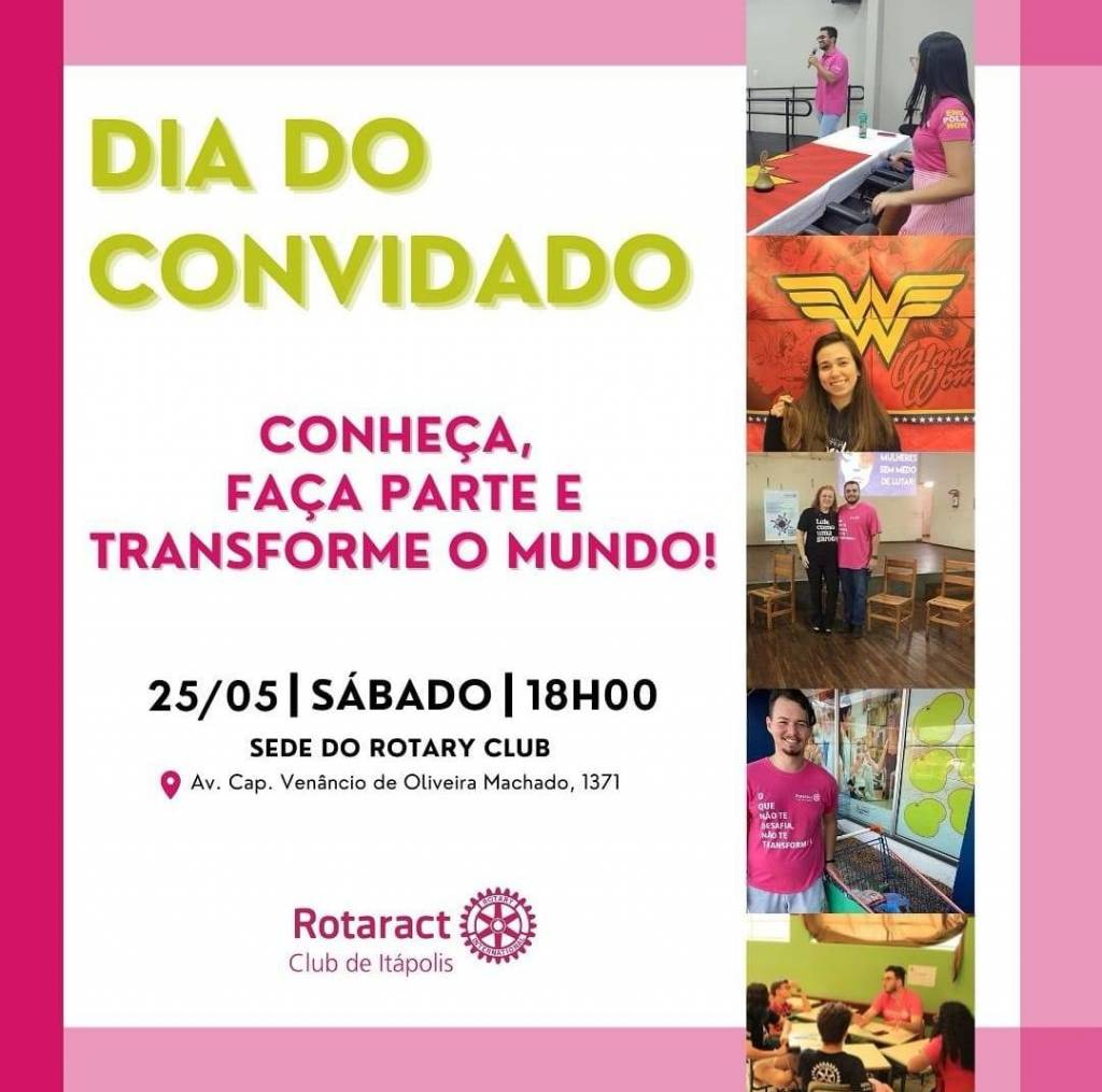 Card com fundo branco, moldura reta em tons de rosa. Na lateral esquerda, ocupando quase todo o espaço, escrito na cor verde com letras grandes: Dia do Convidado. Abaixo escrito em rosa escuro: Conheça, faça parte e transforme o mundo!. Na sequência, escrito em tom terroso: 25 de maio, sábado, às 18 horas na Sede do Rotary Club, na Avenida Capitão Venâncio de Oliveira Machado, 1371. Abaixo o logo em rosa do Rotaract Club de Itápolis. Do lado direito uma faixa vertical com cinco fotos, uma abaixo da outra, a primeira com um jovem usando o microfone e uma jovem logo atrás da mesa observando o palestrante; a segunda foto, com uma jovem sorridente com cabelos compridos com o fundo de uma imagem com o logo da mulher maravilha , a terceira com uma jovem e um jovem de pé, entre algumas cadeiras de madeira numa sala onde no fundo tem um painel com imagem projetada, a quarta foto com um jovem sorridente segurando um carrinho de supermercado e a quinta foto uma sala com alguns jovens sentados em uma roda de estudo.