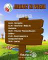 No card com o desenho de um gramado e com uma ponte e um pequeno rio, do lado esquerdo superior temos um circulo branco com moldura verde, tendo o desenho vermelho de um terreno arado com desenho de três vagens de trigo na cor verde e do lado superior direito está descrito: Juntaract na Fazenda - Plantando para Colher. Logo Abaixo escrito o Cronograma, com as informações do cronograma escrito em um desenho de uma placa de madeira : 14 horas Recepção; 14:30 Abertura e Roda de Conversa; 16 horas Projeto Plantando para Colher; 17:30 horas Encerramento e Companheirismo e 18:30 horas Jantar. Abaixo o logotipo na cor branca do Rotaract Club de Auriflama