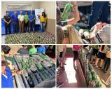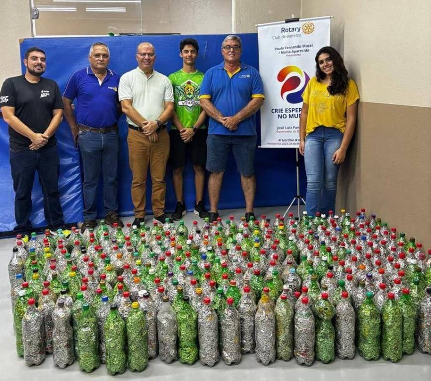 Audiodescrição: Foto em um ambiente fechado, onde identificamos 4 homens, um jovem e uma jovem. As paredes possuem coloração creme na parte de cima e tons mais escuros na parte de baixo. Ao fundo dessas pessoas há uma estrutura azul e o banner da gestão 2023-24 do Rotary Club de Barretos, onde seu Pres. Paulo Mazzer está presente ao lado dos jovens e do banner. No chão é possível ver centenas de garrafas de plástico cheias de lacres de alumínio.