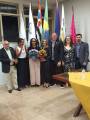 Audiodescrição: Foto em um ambiente fechado, onde7 pessoas posam para uma foto, sendo 3 homens e 4 mulheres, todos muti bem vestidos, estão na frente de um pavilhão, onde 7 bandeiras estão visíveis. Na frente das 3 pessoas do lado direito da foto é possível ver uma mesa de madeira com o tambo de vidro e uma toalha amarela, com um copo e uma garráfa de água. As mulheres no centro da foto carregam arranjos de flores.