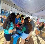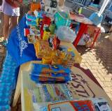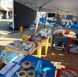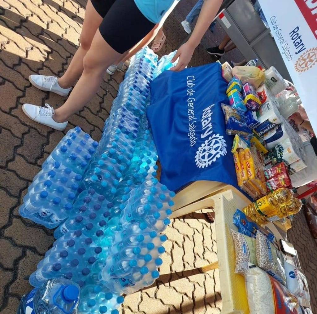 Observamos algumas jovens no local e muitas doações como: fardos de água mineral e em mesas amarelas de plástico estão muitos mantimentos não perecíveis e produtos de higiene pessoal. Nas mesas existe uma bandeira azul do Rotary Club de General Salgado.