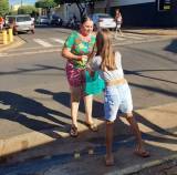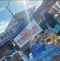 Na foto um dia com raios solares em evidência e um céu azul com poucas nuvens, mostra uma rua com seus prédios e comércios, que trás também uma tenda azul com branco e um grande cartaz pendurado nela com os dizeres em vermelho e preto: