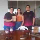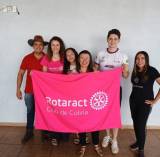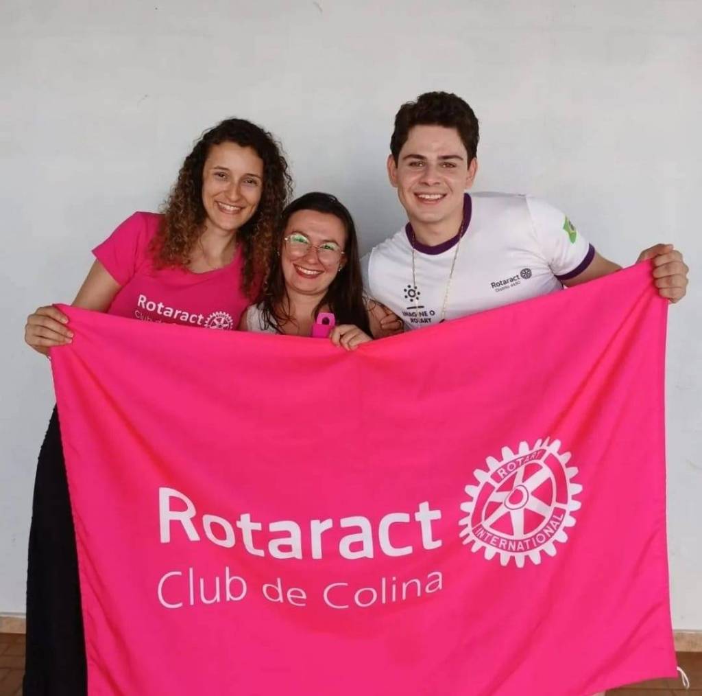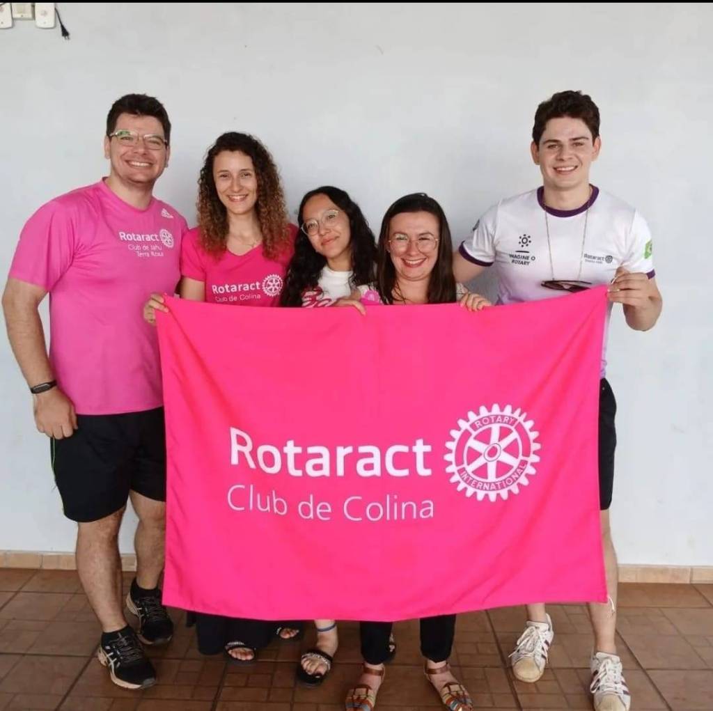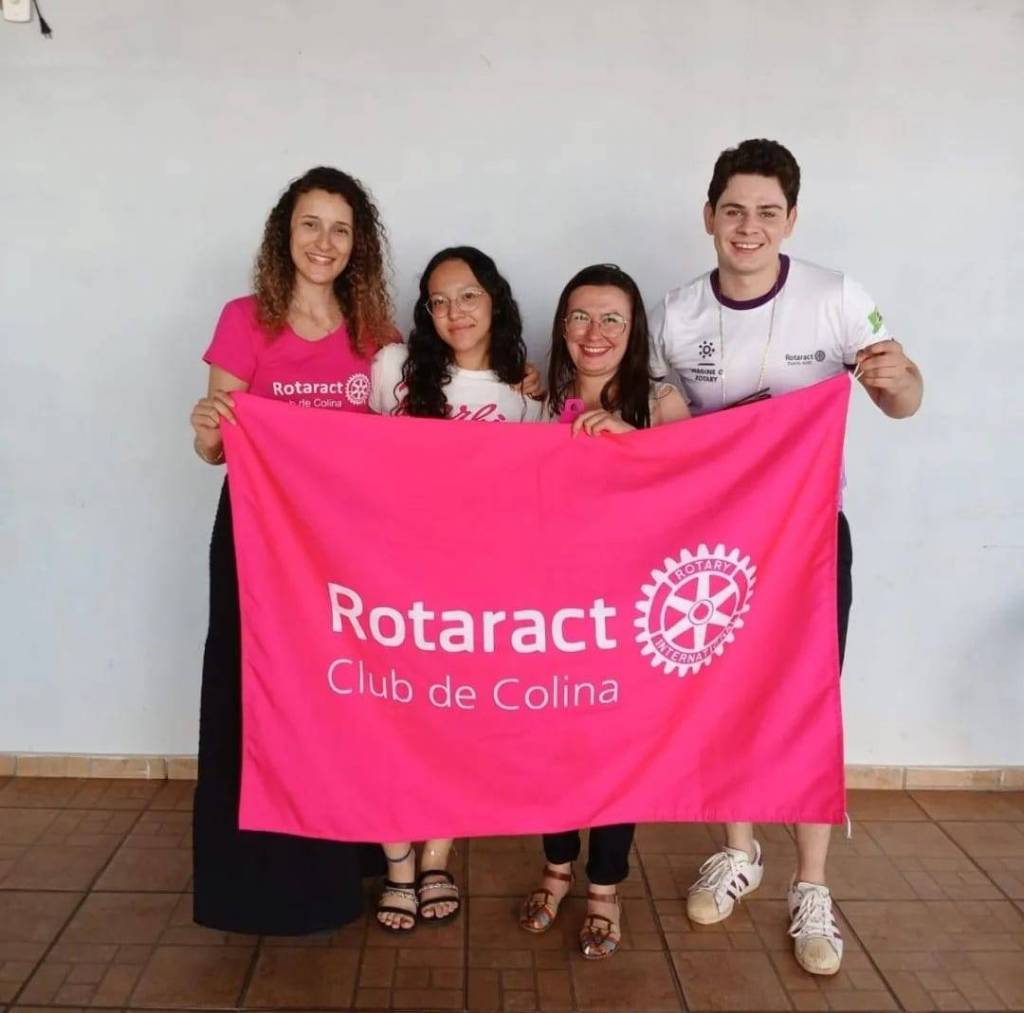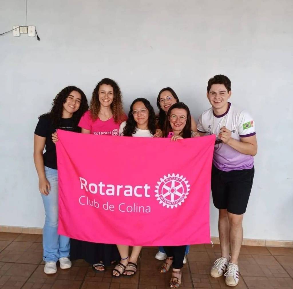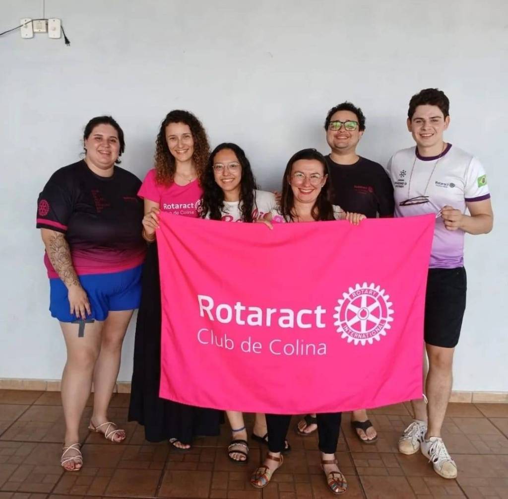 Audiodescrição: na foto, imagem de 13 pessoas entre homens e mulheres, jovens, sorridentes, atras de bandeiras rosas do Rotaract Club de Colina, ao fundo, duas janelas de vidro. Na frente, uma mesa de madeira com alguns adornos em cima.