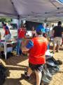 Audiodescrição: na foto, imagem de alguns adultos e crianças, eles posam para foto, alguns em pé outros agachados, estão em frente a um caminhão baú, onde e possivel notar vários sacos pretos, caixas de papelão e água. No fundo, imagem de árvores.