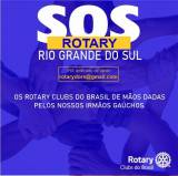 Em primeiro plano acima centralizado em letras grandes brancas SOS. Logo abaixo em um retângulo amarelo a palavra Rotary em letras azuis. Seguindo abaixo em branco: Rio Grande do Sul.