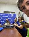 Audiodescrição: na foto, duas pessoas lado a lado, dois homens, lado direito um rapaz de cabelos enrolados, castanhos, usa oculos, camiseta verde, com as mãos para baixo, sorri discretamente. Do seu lado, um jovem senhor de camiseta azul do Rotary, cabelos levemente grisalhos, com a mão direita no bolso na calça, sorri discretamente. No fundo na parede dois quadros pendurados. Na frende deles parece ter duas mesas de madeira.