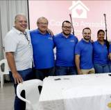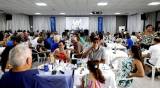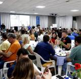Audiodescrição: na foto, imagem de várias pessoas em um salão, sentados em cadeiras com mesas, pratos e copos em cima das mesas, as pessoas conversam entre si. No fundo se nota um telão na parede e cortinas em volta, alguem no fundo da sala fala ao microfone.