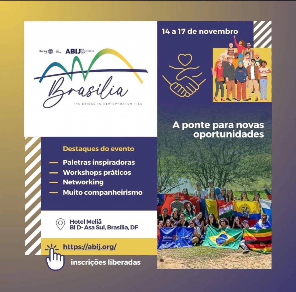 Audiodescrição: no card, de fundo degradê entre roxo e amarelo, um folder montado, lado esquerdo superior imagem Rotary ABIJ 43ª Conference 2024 abaixo um desenho colorido como de fosse de uma montanha de três morros com um risco no meio, abaixo escrito: Brasilia The Brigde to new opportunities, abaixo, Destaques do evento - palestras inspiradores, - workshops práticos, - networking, - muito companheirismo. Na sequencia sinal de localizador: Hotel Meliã, BI D - Asa Sul, Brasilia, DF, desenho de uma mãozinha como se estivesse clicando em um link e ao lado https://abij.org/ incrições liberadas. Do lado direito do card, no topo, 14 a 17 de novembro, abaixo desenho de duas mãos se apertando com um coração em cima e imagem de um desenho de várias pessoas lado a lado em um quadrado. Abaixo: a ponte para novas oportunidades. E abaixo disso, foto de várias pessoas segurando bandeiras de vários países, incluindo a bandeira do Rotary, elas estão em um lugar com grama e árvore ao fundo.