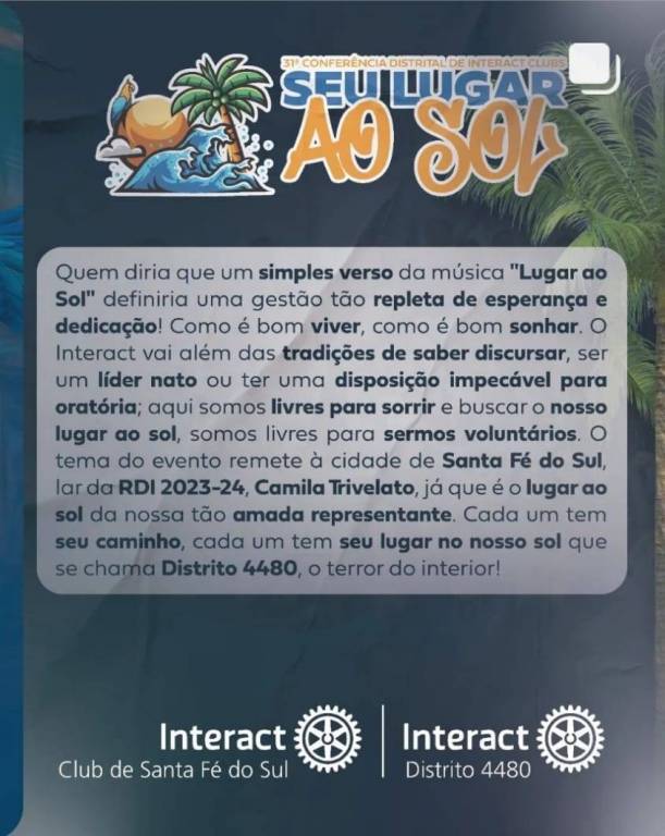 Esperamos por você no dia 22 de junho de 2024 em Santa Fé do Sul. Cada um tem seu caminho, seu lugar no nosso sol chamado Distrito 4480, o Terror do Interior!