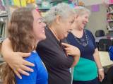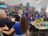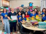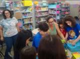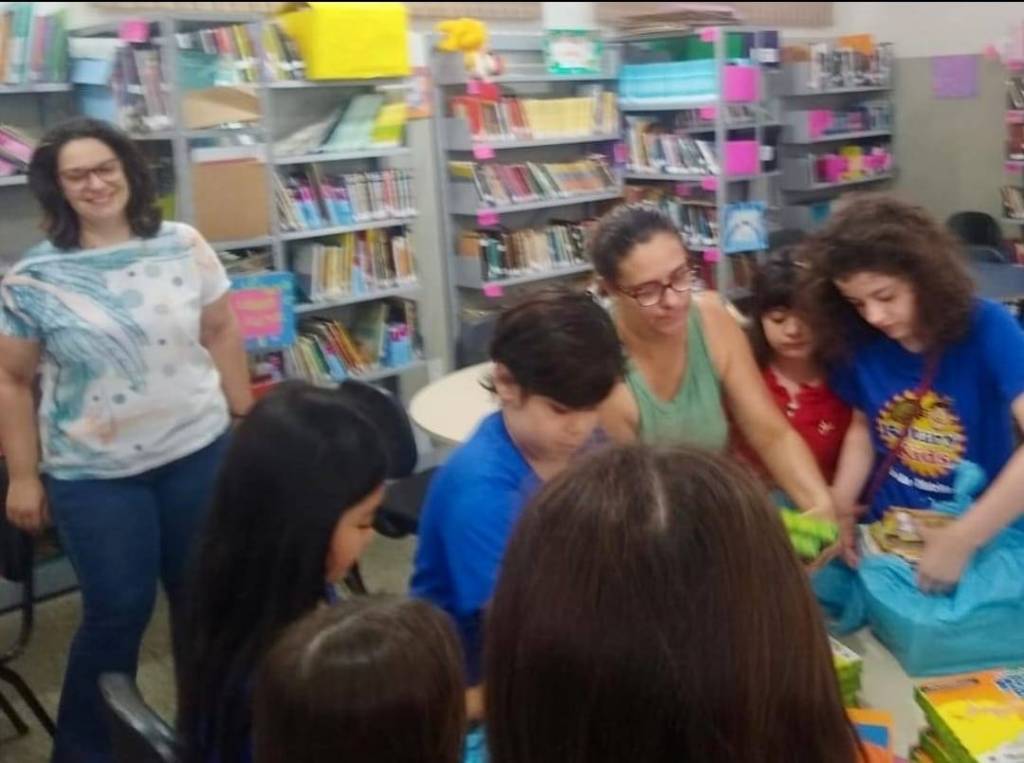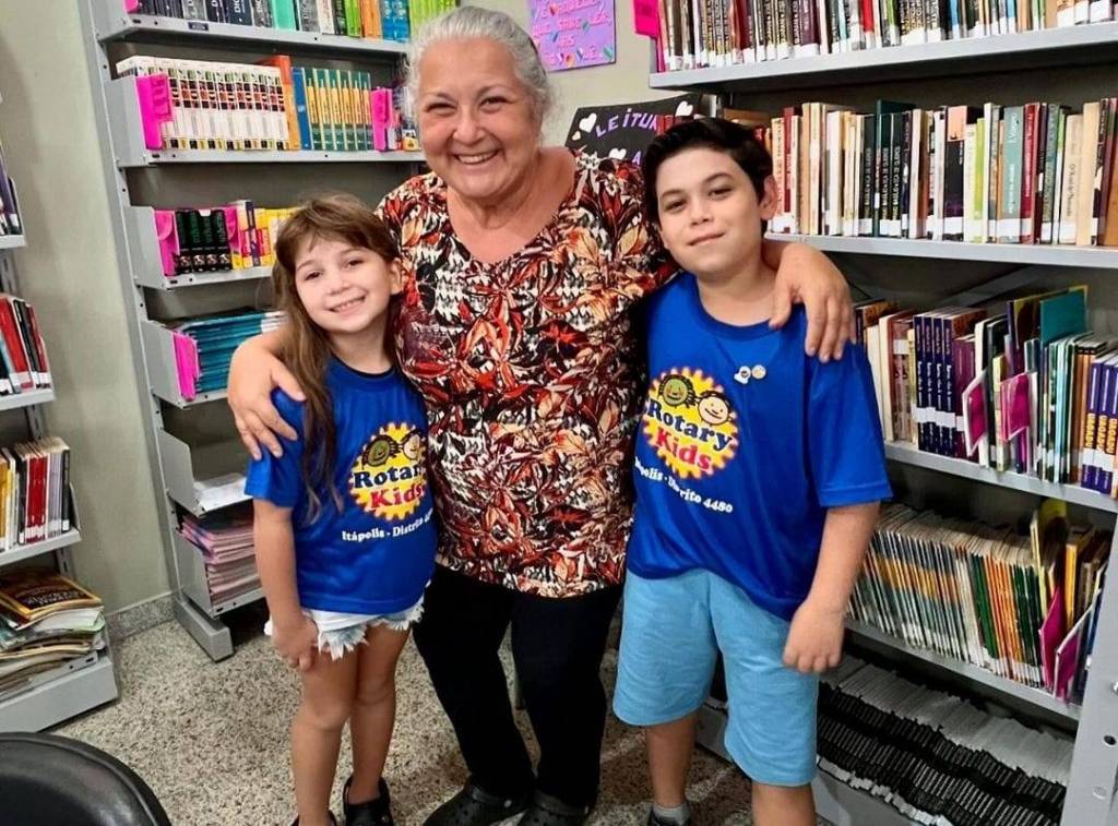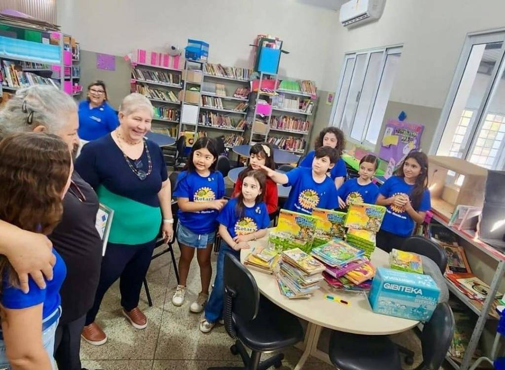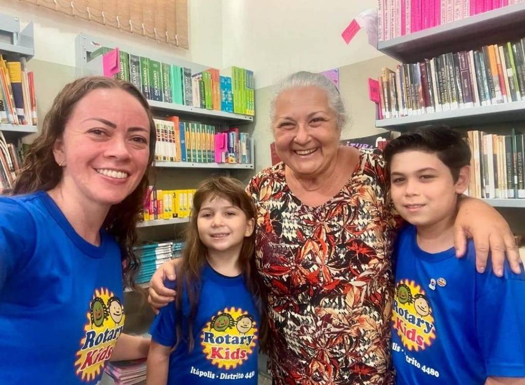 Audiodescrição: na foto, 4 adultas e 7 crianças posam para foto em uma sala repleta de prateleiras a o fundo com livros, na frente delas, uma mesa com inumeros livros em cima da mesa, Todos sorriem e as crianças usam camiseta do Rotary Kids de Itápolis.