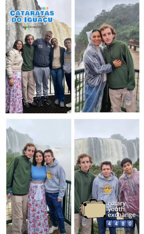 Audiodescrição: na foto, 4 pessoas lado a lado, abraçadas, posam para foto em frente uma catarata de águas. Em cima, lado esquerdo identificando Cataratas do Iguaçu. Do lado direito inferior, desenho de uma mala e rotary youth exchange 4480.