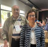 Audiodescrição: na foto, um senhor calvo, com uma jaqueta bege, calça jeans e camiseta listrada, está com as mãos cruzadas na frente da barriga, sorri discretamente. Usa um crachá pendurado no pescoço. Atrás, um painel com simbolos pequenos esparramados pelo painel, do lema crie esperança no mundo e do Rotary Distrito 4480.