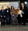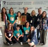 Audiodescrição: na foto, 5 pessoas identificadas, da direta para esquerda, Gov. Pavan, do seu lado uma jovem de cabelos escuros, casaco branco, calça preta e blusa bege, sorri, do seu lado, Rita Pavan, ao seu lado um rapaz calvo, de óculos, casaco preto, blusa preta e calça jeans, ele sorri muito e segura um quadro, com a mão direita ele coloca o quadro no alto para visualização de todos, no quadro, temos o simbolo da END POLIO NOW e ao lado desse rapaz, Gerson Januário. Atrás deles, um painel com identificação da 47ª Conferência. Todos na foto estão sorridentes.