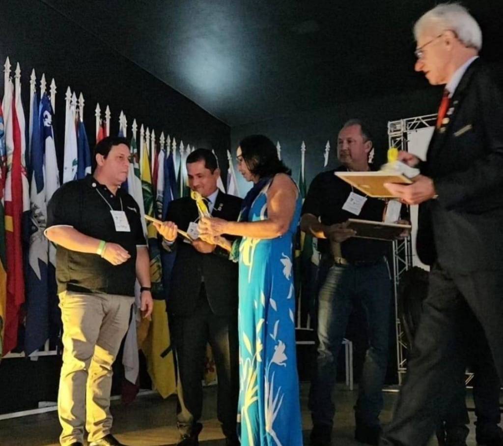Audiodescrição: Foto em um ambiente fechado com paredes escuras, identificamos 2 homens, cada um segura com suas mãos esquerdas um certificado emoldurado e um troféu branco com a mão direita, dentro de um plástico com uma fita amarela no topo. O rapaz da esquerda veste uma camiseta escura com o logo do Rotary International, com as letras em branco e a Roda Rotária em amarela, está com um crachá branco pendurado no pescoço e uma pulseira verde no pulso direito. Veste calças claras, possui cabelos escuros curtos e barba raspada. No lado direito está um homem de pele clara, terno e gravata escuros e camisa clara, ostenta o título Paul Harris e o lema presidencial Crie Esperança no Mundo na lapela do terno, possui cabelos escuros curtos e a barba também feita. Ambos sorriem pra foto. Ao fundo vemos as bandeiras das cidades quem compõe o Distrito 4480 hasteadas.