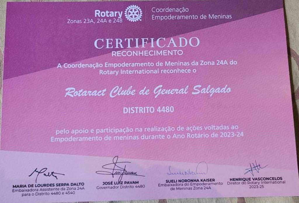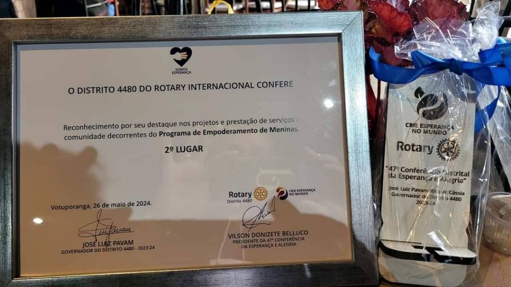 Representado pelo Casal Pres. Anderson e Ilta, o clube foi premiado em Segundo Lugar em Projetos de Empoderamento de Meninas.