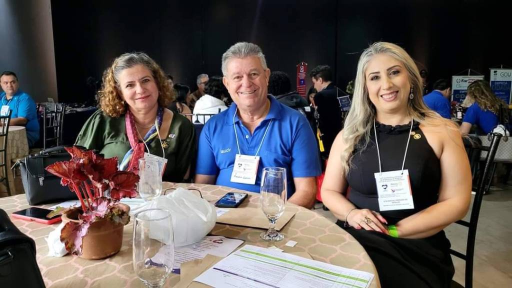Em um palco, da esquerda para a direita: um senhor terno escuro, óculos, com os braços esticados cruzados a frente do corpo, uma mulher de vestido longo estampado, cabelos médio na cor preta, óculos, com os braços cruzados para trás do corpo, é a Governadora Rita, seguindo o Governador Pavam, cabelos grisalhos, óculos, terno preto, braços esticados cruzados a frente do corpo, uma mulher cabelos longos, loira, segurando com a mão direita um microfone, a esquerda segurando um certificado na moldura, blusa e calça preta. Aparenta estar falando ao microfone, uma mulher de calça e blusa bege, lenço no pescoço, braço esquerdo para trás do corpo e braço direito rente ao corpo. Ao fundo um grande banner com fundo branco descrevendo a quadragésima sétima conferência distrital da Felicidade e da Alegria - vinte e quatro a vinte e seis de maio em Votuporanga. Lado direito do banner o lema crie esperança no mundo e lado esquerdo o símbolo do rotary.