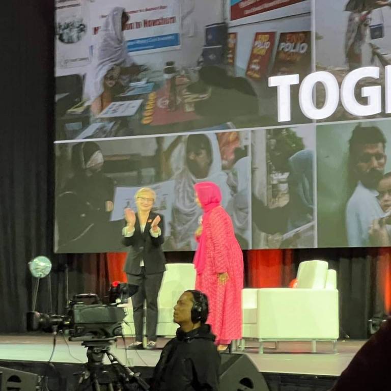 Tayyaba Gul, na Convenção do Rotary de 2024, uma trabalhadora da linha de frente que dirige um Centro de Recursos da Poliomielite no Paquistão. Ela representa um dos recursos mais valiosos na erradicação da poliomielite.