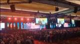 Na foto observamos cinco mulheres, onde duas estão de pé e três estão agachadas na frente das duas. Atrás delas tem um banner da Casa da Amizade. Estão todas sorridentes em um ambiente com tons claros. Do lado direito delas tem uma maca hospitalar com vários kits em sacolas de cor clara e várias outras em tons escuros.