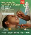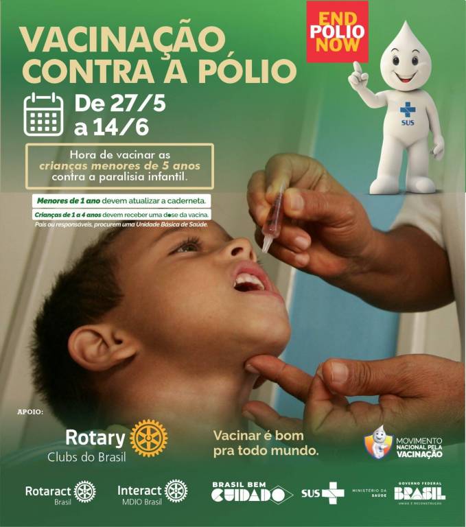 No card com fundo verde temos ocupando uma tarja no centro a foto de uma criança com a cabeça inclinada para trás e as mãos de uma pessoa apoiando o queixo da criança e colocando uma gotinha de vacina na boca da criança. Acima descrito em amarelo claro: Vacinação Contra a Pólio. Do lado direito acima a imagem do Zé Gotinha todo de Branco no peito o logo do Sus apontando para o logo do End Polio Now. Logo abaixo do lado esquerdo descrito em branco: de 27 de maio e 14 de junho Hora de Vacinar as crianças menores de 5 anos contra a paralisia infantil. Menores de 1 ano devem atualizar a caderneta e crianças de 1 a 4 anos devem receber uma dose de vacina. Pais ou responsáveis procurem uma unidade básica de saúde. Logo abaixo numa tarja em verde degradê o logo do Rotary Clubs do Brasil. No centro descrito em amarelo: Vacinar é bom pra todo mundo. Do lado direito o logo do Movimento Nacional pela Vacinação. Abaixo os logos na cor branco do Rotaract Brasil, Interact MDIO Brasil, Brasil Bem Cuidado, Sus, Ministério da Saúde e Governo Federal do Brasil União e Reconstrução.