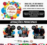 No card com fundo branco observamos do lado esquerdo um circulo branco descrito dentro dele na cor laranja: 16ª Festa das Nações Ibirá SP. Em volta desse circulo branco tem vários desenhos de prédios, monumentos, casas, igrejas, torres, em linhas brancas. e círculos coloridos de diversas cores entre vermelho, azul, amarelo, laranja. Do lado direito do círculo colorido, está descrito em preto: Dias 30, 31 de maio e 01 de junho de 2024. Local Avenida Mário de Carvalho Silva. Atrações Musicais, brinquedos gratuitos para crianças, pratos típicos, escolha da rainha e apresentações. Numa tarja preta horizontal no centro do card descrito em branco: Atrações Principais. Abaixo 3 informações das atrações principais, uma do lado da outra com a imagem dos cantores, sendo eles: dia 30 de maio quinta-feira, Loubet. Dia 31 de maio sexta-feira, Charles & Mancini e dia 01 de junho, sábado, Zé Henrique & Gabriel. Logo abaixo descrito Realização e do lado direito o logo da Secretaria de Turismo de Ibirá e da Prefeitura Municipal de Ibirá. Numa tarja horizontal ocupando todo o espaço na parte inferior do card, o desenho de metade das bandeiras oficiais de vários países,