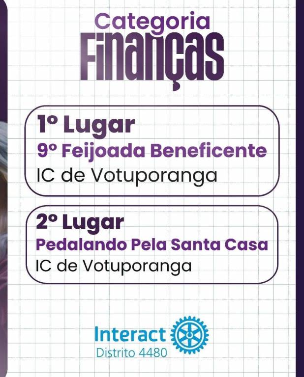 Card com fundo lilás matizado, trás acima centralizado em letrinhas brancas: Finanças, Fundação Rotária, Meio Ambiente, Comunidades e Internos. Abaixo em uma faixa branca e letras roxas: Finalistas para a 2° Fase.