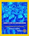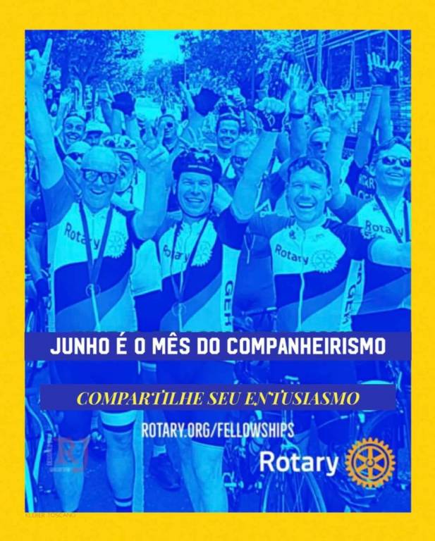 Card com moldura amarela e fundo totalmente em azul, onde observamos uma foto com muitas pessoas com roupa de ciclismo, com os braços para cima, todos sorridentes em uma rua arborizada. A maioria deles está de pé e outros estão na bicicleta. A foto esta com um tom azulado. Na parte inferior da foto, está descrito em branco: Junho é o mês do Companheirismo. Na cor amarelo abaixo, descrito: Compartilhe seu entusiasmo. E abaixo em branco: Rotary.org/Fellowships. Na parte inferior direita está o logo branco do Rotary com a Roda rotária na cor amarelo.