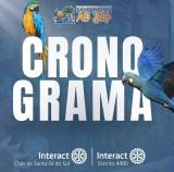 No Card com fundo azul, com imagens da natureza quase imperceptíveis, temos o logo do CODIC Seu Lugar ao Sol. Está descrito na cor branco, com letras grandes que quase ocupam todo o card: Cronograma. Há uma arara sobre a letra C da palavra Cronograma, na parte superior esquerda e quase ocupando a frente da ultima letra da palavra Cronograma temos a imagem de uma arara azul em posição de voo. Na parte inferior os logos na cor branco do Interact Club de Santa Fé do Sul e Interact Distrito 4480.