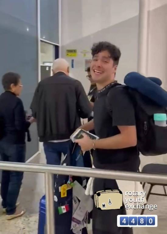 Na foto observamos um jovem sorridente com mochila nas costas usando camiseta na cor preto. Esta com um passaporte nas mãos no corredor de embarque de um aeroporto. O local tem paredes em tons claros, nas cores cinza e branco. Na frente do jovem há um senhor com cabelos grisalhos e casaco em tons escuros e uma senhora na esquerda usando roupas em tons escuros. Abaixo no canto inferior direito o logo do Rotary Youth Exchange 4480