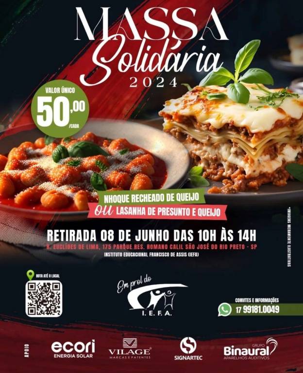 Seguindo em branco: Instituto Educacional Francisco de Assis (IEFA). Abaixo da esquerda para a direita: o símbolo de localização com rota até o local e um QR Code, em prol com a logo do IEFA,convites e informações (17)99181-0049
