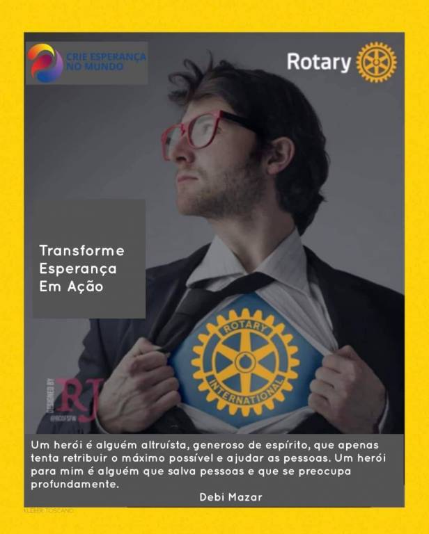 Card em fundo cinza trás no centro a foto de um rapaz usando óculos, de cabelos pretos curtos, vestindo camisa social com gravata e paletó. Ele está de frente mas com a cabeça virada para o lado esquerdo. Com as 2 mãos ele está segurando as laterais da camisa que foi aberta para mostrar a roda rotária em amarelo bem no centro de seu peito em um fundo azul. A imagem faz menção ao Super Homem. Acima na lateral esquerda temos o símbolo da gestão atual: Crie esperança no Mundo. No canto superior direto a palavra Rotary em branco e a roda rotária em amarelo. No meio do card na lateral esquerda dentro de um quadro cinza mais escuro temos em letras brancas: Transforme Esperança em Ação. Mais abaixo as letras RJ em vermelho acompanhadas de designed by em branco. Finalizando o card numa faixa larga com letrinhas brancas pequenas: