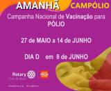 Card com fundo rosa escuro com algumas linhas geométricas nas cores laranja e amarelo acima do canto direito superior e abaixo com a foto em moldura de gota, do rosto de um bebê recebendo uma gotinha de vacina. Está escrito em branco: Amanhã Campanha Nacional de Vacinação para Polio. 27 de maio a 14 de Junho. Seguindo abaixo: Dia D em 8 de Junho. Do lado direito descrito em amarelo: Campólio! Abaixo logo na cor branca do Rotary Clubs do Brasil e logo do End Polio e endpolio.org e #endpolio