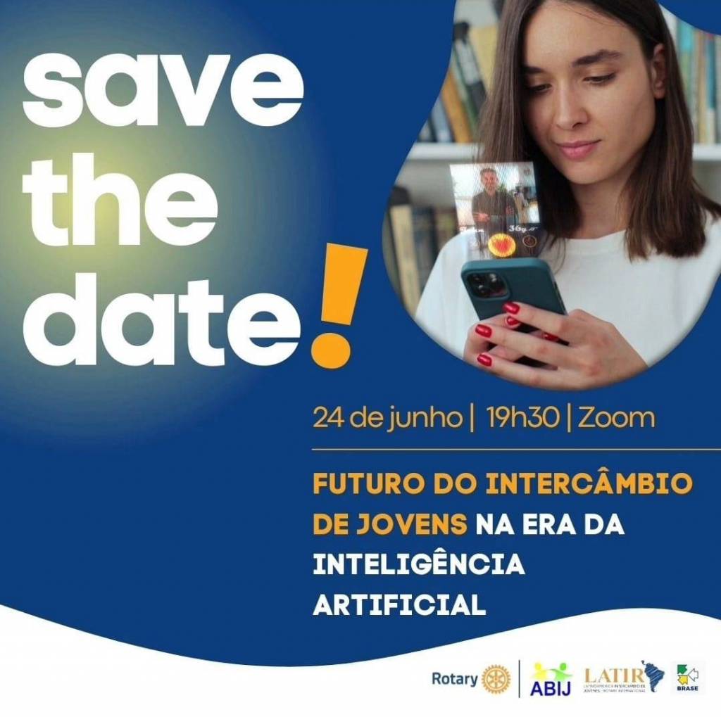 Audiodescrição: Card azul escuro com a parte inferior em forma ondulada na cor branca. No canto inferior direito dessa parte branca está o logo do Rotary International, o logo da ABIJ, o logo da LATIR e o logo da Brase. No canto superior esquerdo temos uma fonte de luz em amarelo desfocado com o escrito "Save de date" em branco com um símbolo de exclamação em amarelo sobre essa fonte de luz. No canto superior direito temos a foto de uma jovem com cabelos longos na cor castanho escuro, veste uma camiseta branca e está mexendo em um celular. Esta foto está em uma moldura com formatos circulares. Abaixo está escrito em amarelo: "24 de junho - 19:30h - Zoom - o futuro do intercâmbio de jovens" e, na sequência, escrito em branco"na era da inteligência artificial ".