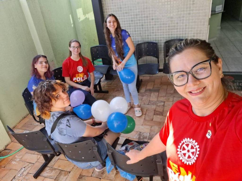 A jovem que está na lateral direita está agachada sorrindo, tem cabelos longos soltos, usa calça jeans e camiseta azul do Rotary e tem uma bexiga azul na mão direita. No centro observamos um molde em madeirite compensado branco no formato do Zé Gotinha com uma gravata borboleta amarela no pescoço. No molde no lugar do rosto existe um círculo vazado onde um rostinho de criança sorridente está visível. O lugar é aberto e provavelmente elas estão em frente de uma unidade de saúde, pois logo atrás temos uma porta de vidro, uma parede lateral direita de pastilhas verde claro e uma placa de metal prata com inscrições. O chão é de piso marrom claro e tem uma faixa de segurança azul no centro.