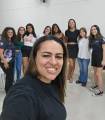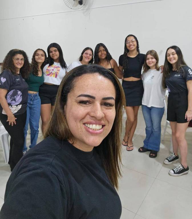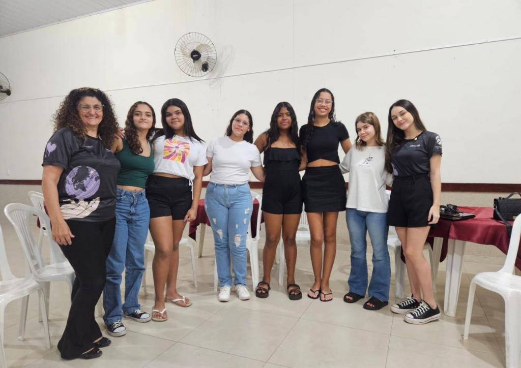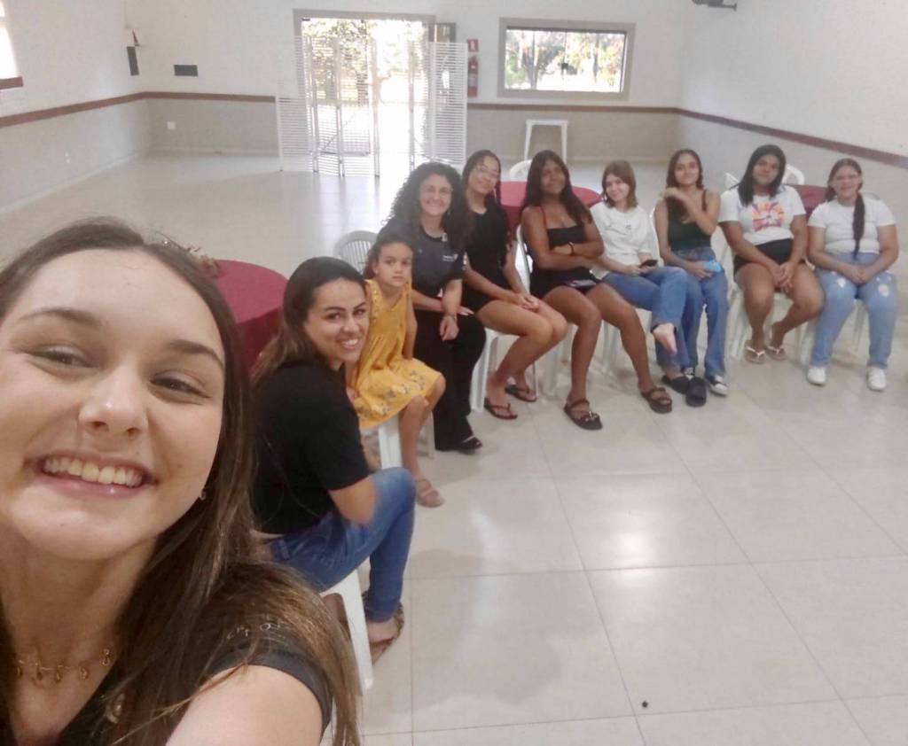 Audiodescrição: Foto em um amplo salão fechado, com o chão e a metade inferior da parede em tom cinza claro e a parte superior em branco. Na foto tirada como uma selfie, observamos 9 garotas, sendo 2 adultas e as demais sendo mais jovens. Estão todas sentadas em cadeiras de plástico brancas, sorrindo e posando para a foto. Em primeiro plano, temos a jovem Izabelli, RDI na gestão 2024-25 do Distrito 4480. Ao fundo há uma porta ampla e uma janela, ambas abertas.