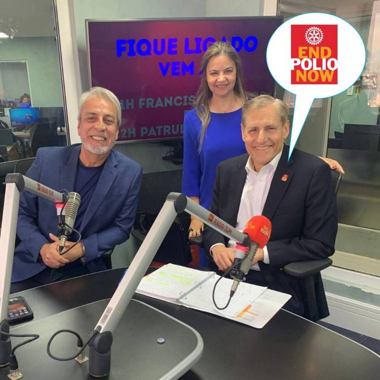 Imagem de uma mesa com dois grandes microfones, com um caderno aberto sobre a mesa. Sentados atrás da mesa do lado esquerdo um senhor, sorrindo, de blaiser azul marinho e camiseta preta, barba e cabelos grisalhos, com as mãos juntas a frente do colo. Ao seu lado indo para a direita um senhor sorrindo blaiser preto, camisa rosa clara, cabelo grisalho e em destaque no blaiser um bóton da end pólio now - onde um balão na cor branca indica o destaque deste bóton. Ao lado deste senhor, uma mulher com roupa na cor azul, sorrindo, cabelos longos, com o braço esquerdo no ombro do senhor e o braço direito rente ao seu corpo. A mulher fica em pé entre os dois. Aparenta os homens estarem fazendo entrevistas e falando ao microfone. Ao fundo um telão na cor vinho.