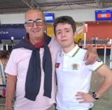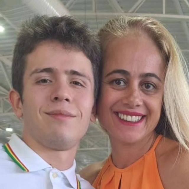 Lado esquerdo imagem de meio corpo de um jovem, sorrindo, camiseta polo branca com a bandeira da França na camiseta lado direito dele e uma mulher loira, cabelos longos, blusa laranja, sorrindo. Estão abraçados.