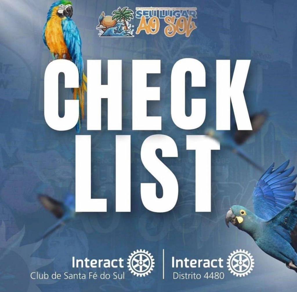 No centro escrito em destaque na cor branca: Check List - na letra C a figura de uma ave arara peito amarelo e asas azuis.