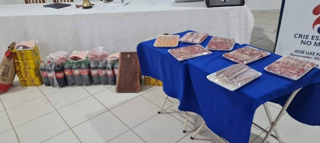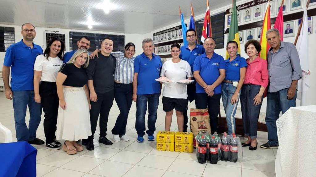 Na foto várias pessoas entre homens e mulheres sorridentes, estão posicionados lado a lado. A maioria veste camiseta azul do Rotary. O lugar é fechado, iluminado, tem parede verde clara com 3 quadrinhos no fundo e bege clara com um suporte de madeira para plantas no lado esquerdo. À frente deles em uma mesa redonda temos vários pacotes de cortes de carne, de linguiça, de espeto; todos crus e uma jovem segura nas mãos uma tábua de carne grande. Em 3 cadeiras de ferro com encosto e estofado marrom que estão mais à frente, observamos vários produtos expostos, como: saco grande de carvão, 2 fardos de refrigerante, 2 fardos de cerveja em lata. O piso é claro e no canto inferior direito temos parte de móveis de ferro.