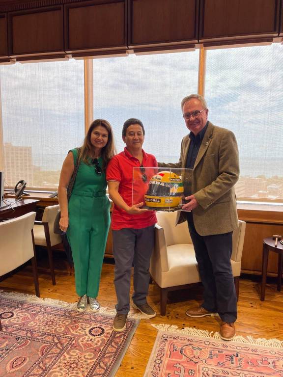 Na foto 3 pessoas identificadas: da esquerda para a direita uma jovem mulher de cabelos claros longos, vestida de verde com um óculos de sol pendurado no decote e com uma bolsa pendurada nos ombros, sorri levemente; a seu lado um homem veste camiseta vermelha com um óculos de sol pendurado na gola, calça jeans, também sorri e segura parte de uma caixa de vidro com um capacete amarelo todo decorado com patrocinadores dentro; a terceira pessoa que também segura parte da caixa de vidro é um jovem senhor grisalho vestindo calça e camisa escuros com um blaizer marrom claro por cima, usando óculos e também sorrindo levemente. O lugar é fechado lembrando um escritório com seu mobiliário clássico e atrás das pessoas uma grande vidraça nos remete a um prédio alto pois observamos a paisagem lá fora de uma cidade com suas construções e o céu com muitas nuvens. É dia.