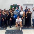 Na foto varias pessoas entre homens e mulheres fazem pose. Eles estão bem juntos, apoiados uns nos outros e sorriem . À frente um rapaz usando óculos e de boné preto está agachado. Em meio a eles apoiado por um rapaz, tem um grande balão transparente com gliter prata que trás vários balãozinho de tons de azul diferentes em sua volta. O lugar é fechado, iluminado e observamos atrás preso em uma parede branca parte de um banner coberto com um tecido verde. O piso é de quadros grandes claros e escuros.