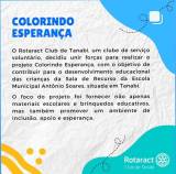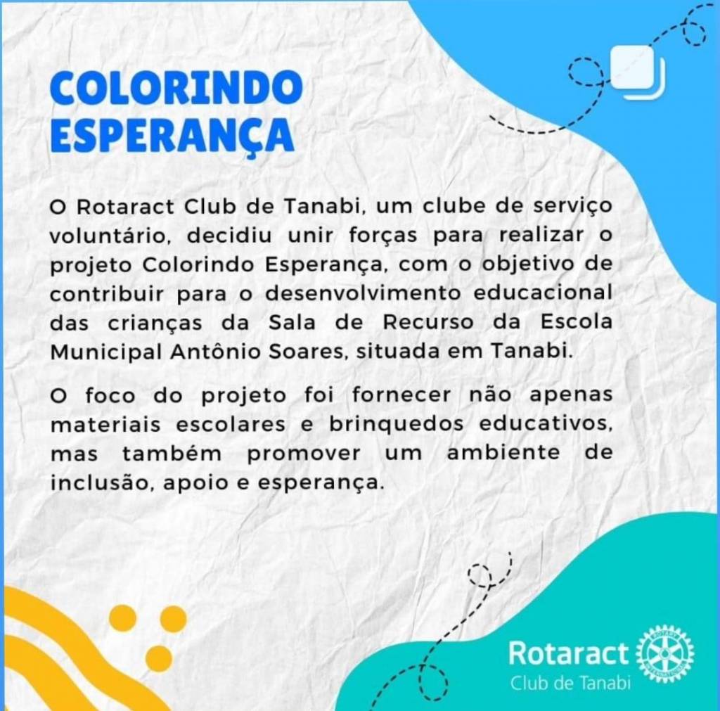 Em um gesto de amor e solidariedade, o Rotaract Club de Tanabi, clube de serviço voluntário, decidiu unir forças e estender sua mão para realizar o projeto Colorindo Esperança, com o intuito de contribuir e ajudar no desenvolvimento educacional das crianças atípicas da Sala de Recurso da Escola Municipal Antônio Soares, situada em um bairro carente de Tanabi.