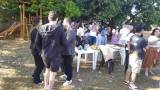 Ao fundo, um local com muitas pessoas, mesas. Aparenta ser ambiente aberto. Aparece parte da imagem com sol.