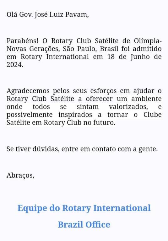 - "Parabéns! O Rotary Club Satélite de Olímpia-Novas Gerações, São Paulo, Brasil foi admitido em Rotary International em 18 de Junho de 2024."