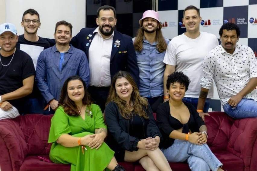 No lado esquerdo da imagem, outro banner com um padrão quadriculado amarelo e branco exibe os nomes e logos de patrocinadores, incluindo Rotaract, Itamarati e outros.